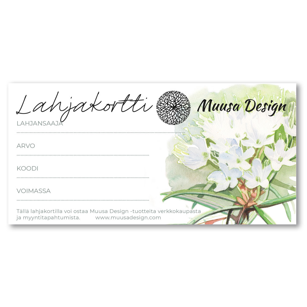 Lahjakortti käy maksuvälineeksi nettikauppaan (www.muusadesign.com), myyntitapahtumissa ja Muusan putiikkiin.