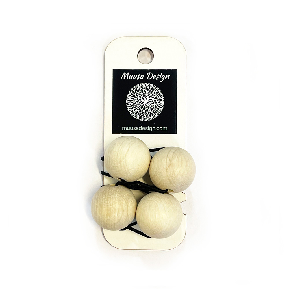 Pakkauksessa 2kpl pompuloita, 4 puuhelmeä kuminauhalla.